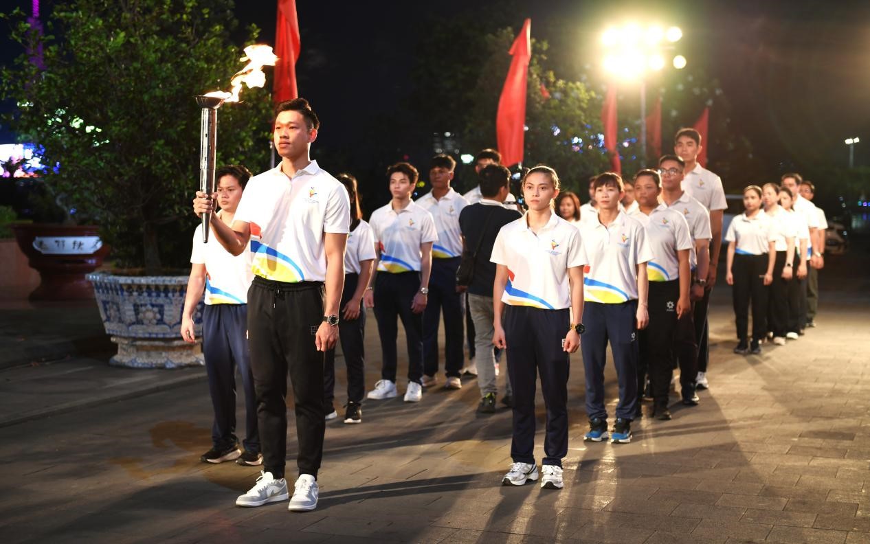 Võ sĩ Pencak Silat Nguyễn Tấn Sang và các vận động viên thực hiện nghi thức rước đuốc.